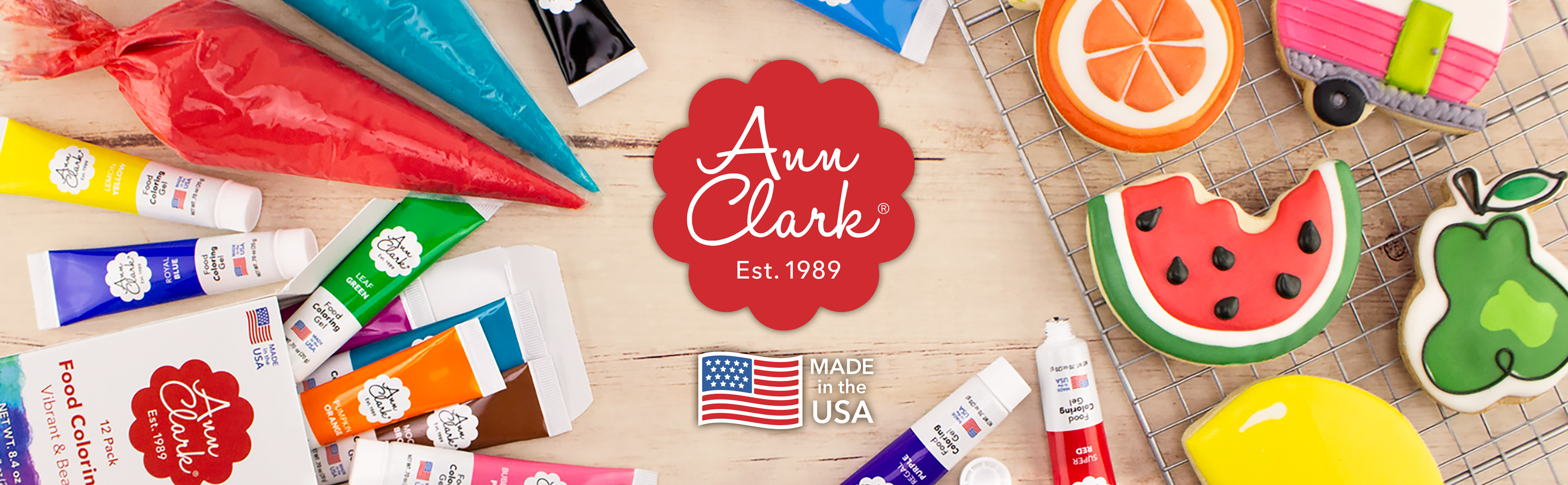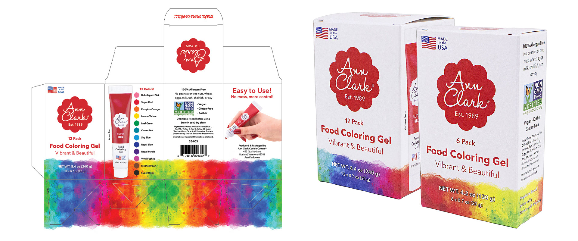 Packaging for food coloring gel- Left is the previous design, to the right is the redesign, with 1st and 2nd iterations between a sticker label and a fully printed tube. I really wanted to reconnect the design for these with the roots of the company and founder herself, Ann Clark; my work was heavily inspired by paint tubes, like the watercolors Ann still uses in the office.